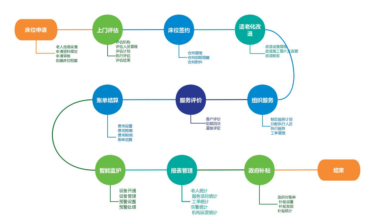 以机构养老实际管理和服务需求为出发点,支持日常基本信息管理、安全监护、健康监测等,涵盖接待到退住的所有流程。